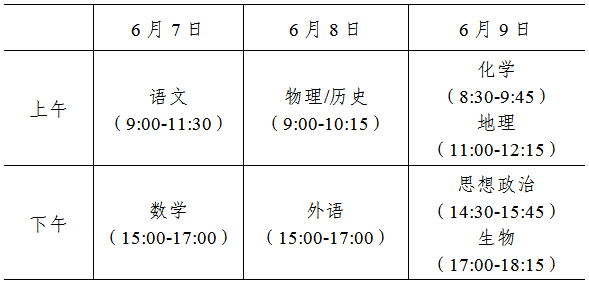 考试时间安排在6月7—9日。语文科目考试时长为150分钟,数学、外语科目考试时长均为120分钟,学业水平选择性考试科目每科考试时长均为75分钟。具体考试安排为:
