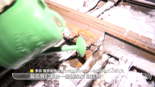 李焱:“我们会用吹雪机对表面的雪进行吹扫。如果雪已经凝固了,在造成设备故障前,我们都会对室外的道岔设备一些关键活动部位,进行人工的清扫。 使用的工具比如说扫把、推雪铲。最后我们要涂一些防冻液 、融雪剂,保证设备第二天不会再被结冻。”