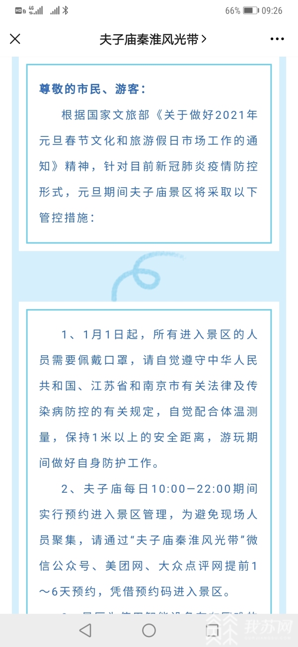 “我们也建议在景区内不要集聚,保持间隔,针对目前限流,我们对瞬时流量也有实时监控,如果人流达到峰值,我们对进口进行临时关闭。”南京夫子庙秦淮风光带风景名胜区管委会名城处处长苏宁说。此外,夫子庙每日10:00—22:00期间实行预约进入景区管理,为避免现场人员聚集,游客可以提前1至6天预约,凭借预约码进入景区。“在线下我们为使用智能设备不方便的老人开辟爱心通道,现场帮他们进入景区。”南京夫子庙秦淮风光带风景名胜区管委会名城处处长苏宁说。