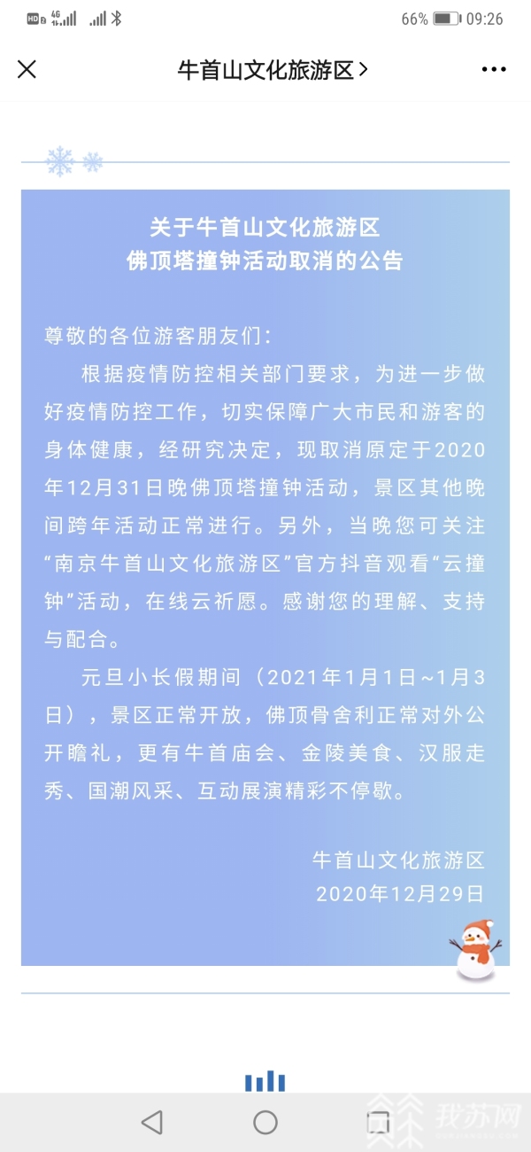 以往每年的跨年活动都是辞旧迎新的重头戏,而今年的跨年活动却有些特殊,受疫情影响,省内不少地方的跨年、祈福活动取消了,南京牛首山文化旅游区29日发布公告,佛顶塔撞钟活动取消,景区也将实行实名制预约入园。