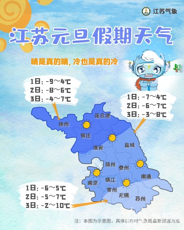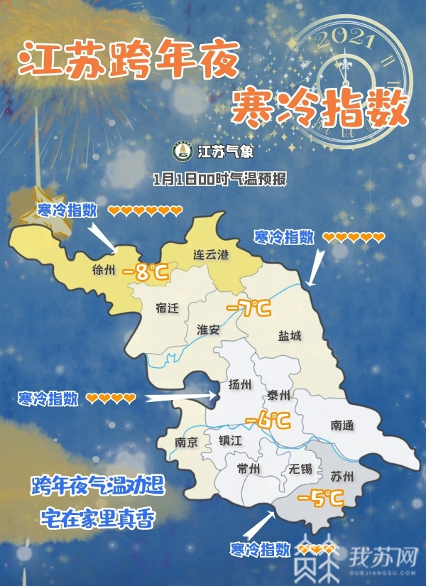 随着阳光逐渐灿烂起来,积雪融化,白天气温依然较低,全省有严重冰冻,不仅如此,跨年夜将一冷到底。值得一提的是,江苏省气象台今天发布了一份跨年夜寒冷指数,快来看看你那儿有多冷?苏北是寒冷指数六颗星,预计在-7到 -8℃,江淮之间是四到五颗星-6 到-7℃,苏南则是三颗星-5℃。所以这么冷的跨年夜,还是劝大家别出门,宅在家里才是真香!