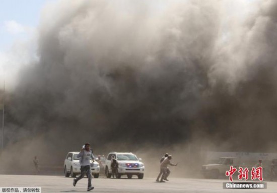 亚丁国际机场30日连续发生3次剧烈爆炸。法新社记者拍摄到的画面显示,机场停机坪在发生爆炸后冒出浓烟滚滚,玻璃和混凝土碎片四散,人们四散逃跑。