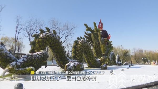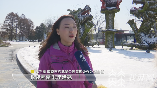 南京市玄武湖公园管理处办公室主任戎飞霞 介绍:“目前玄武湖整个景区银装素裹,非常漂亮。大草坪、内湖区域、情侣园以及菱洲,都非常好看。二龙戏珠,现在是玄武湖景区的标志性打卡景点,这场雪的到来,也给它披上了白色的外装,阳光照耀之下,绿色、金色加上白色,层次也更加丰富了。”