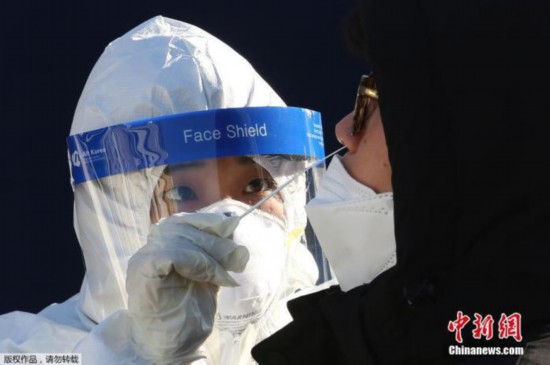 当地时间12月14日,韩国首尔,医务人员正对一名市民进行新冠病毒检测。
