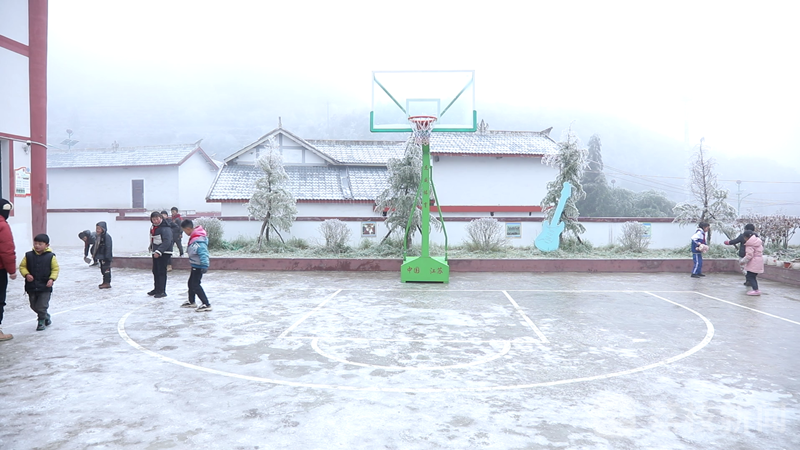 结着冰的操场与路面刚好变身为海嘎小学的游乐场。大点的孩子拿着压扁的油瓶做雪橇,几人一组轮流从高一些的坡道向低处滑行。小些的孩子们从操场的一头溜到另一头,比拼着谁的速度更快。