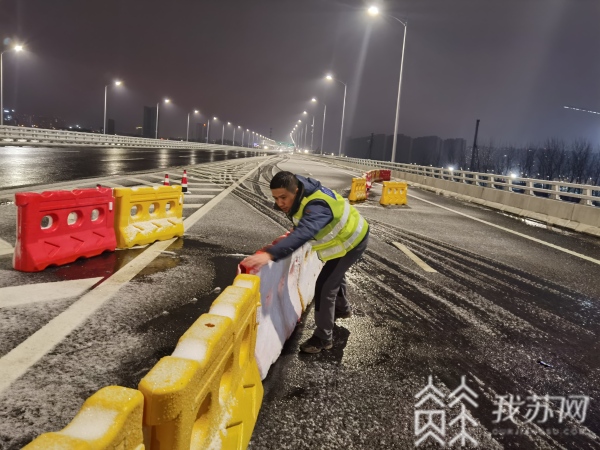 10点半,南京江心洲大桥上空风雪已渐渐停止,但对公司桥梁工程师王安飞来说,最艰苦的任务才刚刚开始,夜间气温持续下降,雨雪积水结冰上冻让桥面通行条件更为不便。