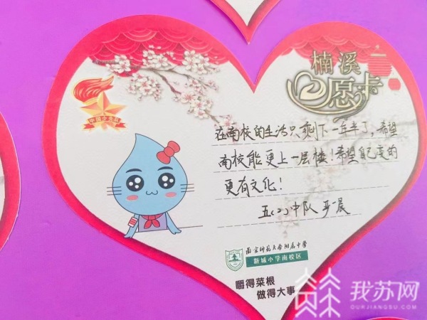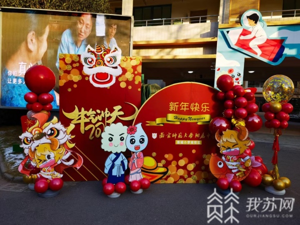 在南师附中新城小学南校区,学校有些许不一样。大门口,孩子们最喜欢的楠楠和溪溪,伸出圆圆的手掌来迎接每个学生的到来。校长叶微站在校门口,和孩子们打着招呼,并提醒小心路滑。大红灯笼高高挂,校园里摆放了火红的大灯笼,教室里映入眼帘的是喜气洋洋的新年祝福语。大家一起把桌椅拉开,留出最大的舞台,把教室装点成最美的样子。排排坐,元旦联欢会就要开始。