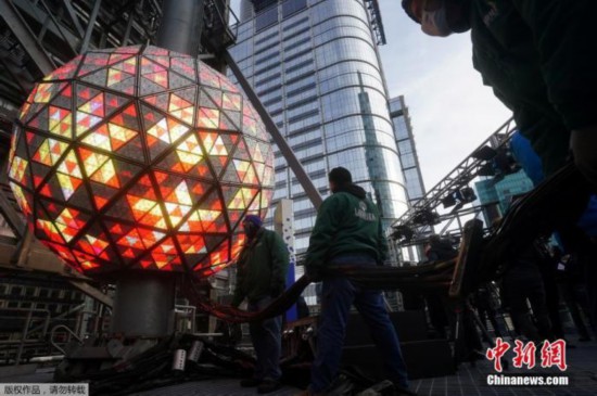 资料图:2020年12月30日,美国纽约,跨年夜在即,工作人员对纽约时代广场的水晶球进行测试。