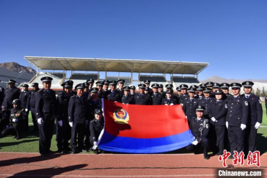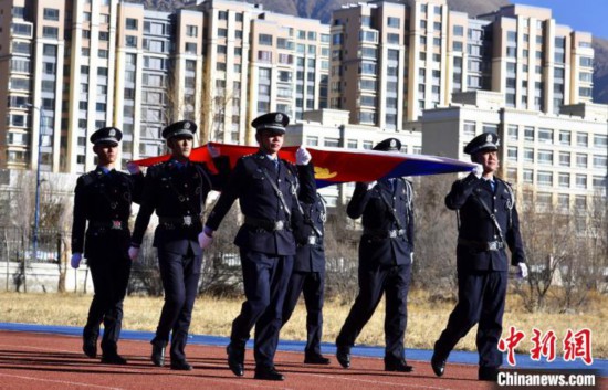 1月1日,拉萨市公安局城关公安分局纳金派出所及辖区的百余名民众着盛装,在西藏大学举行庆元旦、升国旗、喜迎“中国人民警察节”活动。