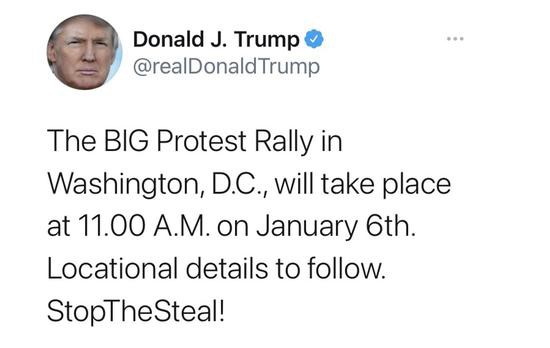 美国总统特朗普当地时间1月1日发推预告称,1月6日上午华盛顿将举行“大型抗议集会”。