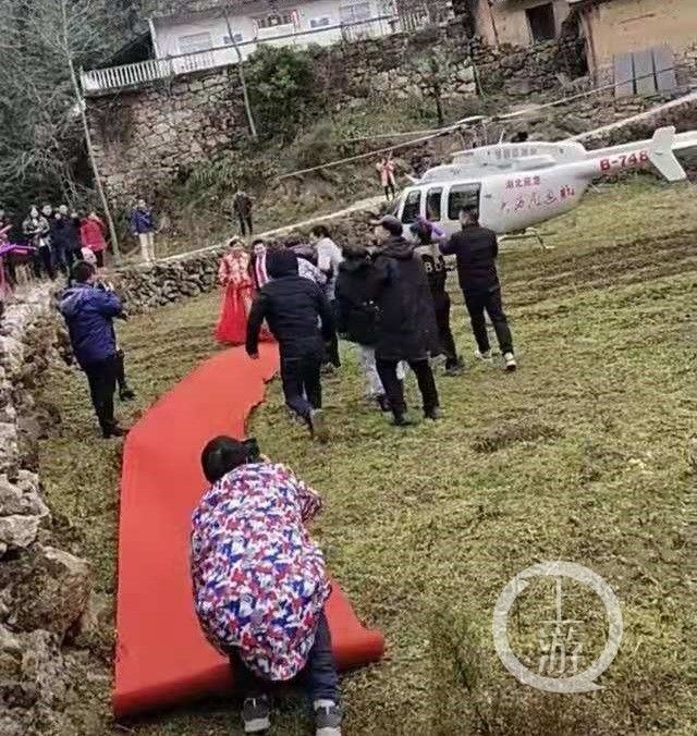 网传视频显示,机身印有“湖北应急”“大西南通航”字样,编号为“B-748D”的白色直升飞机停在田埂上,新郎和新娘从机上下来后,走上红地毯。围观者中,有人喝彩,有人拿着手机拍摄。