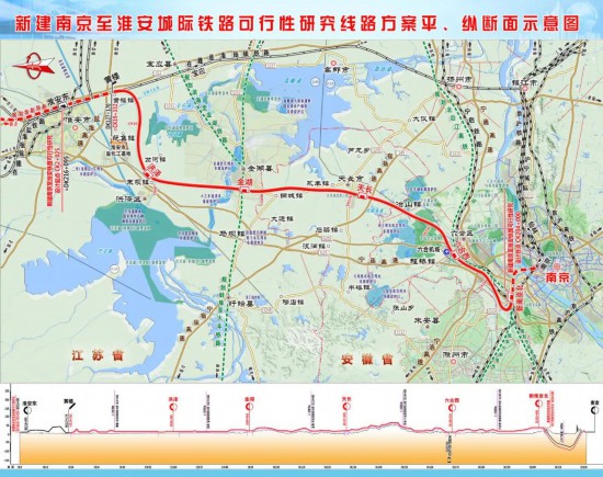 宁淮城际跨苏皖两省,北起江苏淮安市,向南经淮安市洪泽区、金湖县,进入安徽省滁州天长市,再回到江苏省境内,经南京市六合区至新南京北站,全线共设7座车站。设计行车速度350公里/小时,预计2023年建成通车。