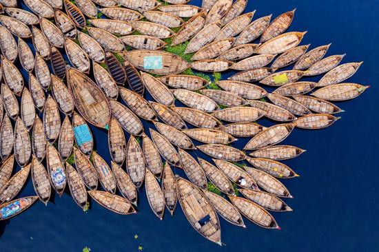 2020年4月3日,在孟加拉国首都达卡,船只集中停泊布里甘加河岸边。为防止新冠疫情扩散,孟加拉国宣布自2020年3月26日起实行全国封锁。