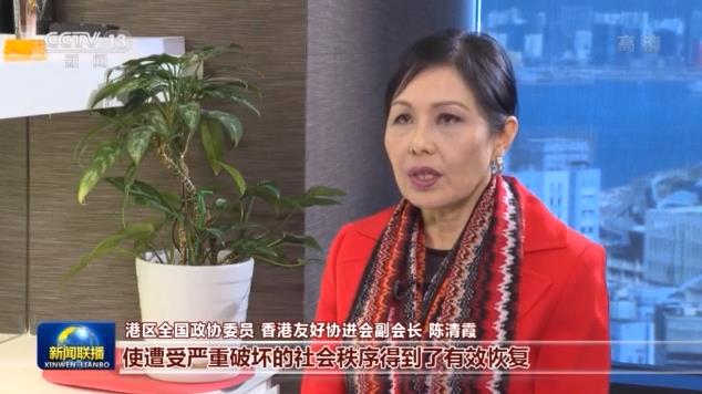 港区全国政协委员、香港友好协进会副会长 陈清霞:港区国安法实施,使遭受严重破坏的社会秩序得到了有效恢复。虽然香港遇到不少的挫折,但是有国家大力支持和坚强后盾,广大市民不退缩、不气馁、不畏惧,团结一致,重振精神再出发。