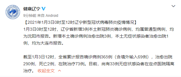 截至1月3日12时,辽宁省累计报告确诊病例365例(含境外输入69例),治愈出院290例,死亡2例,在院治疗73例。目前,尚有33例无症状感染者在定点医院隔离治疗。