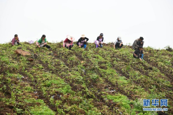 农民在贵州省普安县地瓜镇屯上村的“扶贫茶园”里给茶苗除草(2019年7月7日摄)。当地的茶园栽种有浙江安吉黄杜村捐赠的白茶苗。新华社记者 杨文斌 摄