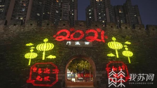 在西瀛里,“喜迎元旦、新年快乐”的字样通过灯光投射在古城墙上,配上汉服、灯笼、祥云等象征中国传统文化的图案,营造出浓浓的喜庆氛围。