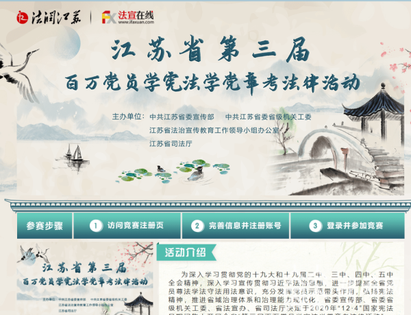 “百万党员学宪法学党章考法律活动”由省委宣传部、省委省级机关工委、省法宣办、省司法厅共同主办,活动开展以来,全省各地主动作为,第一时间发动党员学法考法。南京、泰州、南通、盐城等地将学法资料送进机关、学校、企业、村居,为基层党员学法考试提供便利;无锡、宿迁、常州、连云港等地组织考前学法培训,邀请专家学者专题讲授习近平法治思想、宪法、民法典等;苏州市依托“苏州普法”微信公众号、“e同说法”等平台,面向公众开展线上学法考法活动;徐州市组织普法志愿者、“法律明白人”,积极做好农村党员学法考法宣传发动和服务工作,拓宽了党员考法的影响力和覆盖面。