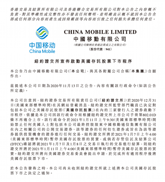 中国移动1月4日在港公告,公司注意到纽约证交所监管部门职员已决定对包括本公司之美国存托股票在内的三家发行人之证券启动下市程序,本公司尚未收到纽约证交所就上述将本公司美国存托股票下市之决定之通知。公司将继续密切关注相关事项的进展,并考虑不同方案和寻求专业意见,未来将根据香港联合交易所有限公司证券上市规则及适用法律按需要适时另行公告。