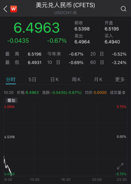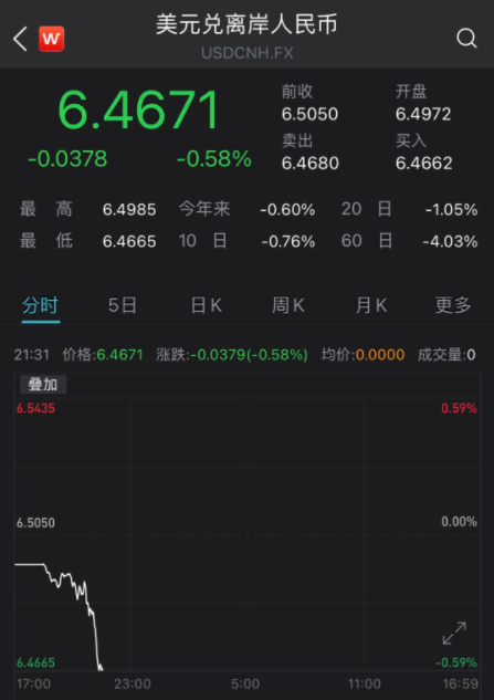 1月4日,离岸人民币对美元汇率接连升破6.49、6.48、6.47关口,最高升值至6.4665,日内升值超过300个基点。