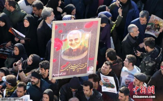 资料图:当地时间2020年1月6日,成千上万的伊朗民众走上德黑兰街头,向被美军击杀的高级军官苏莱曼尼表示敬意。
