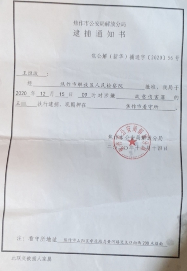 2020年12月15日,经焦作市解放区人民检察院批准,焦作市公安局解放分局对涉嫌故意伤害的王勇执行逮捕,目前王勇羁押在焦作市看守所。