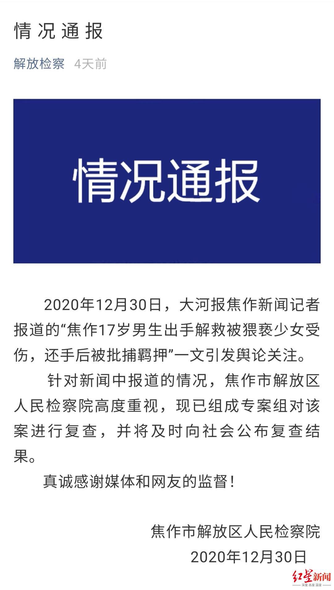 2020年12月30日,焦作市解放区人民检察院发布《情况通报》称,针对媒体报道的情况,该院高度重视,现已组成专案组对该案进行复查,并将及时向社会公布复查结果。