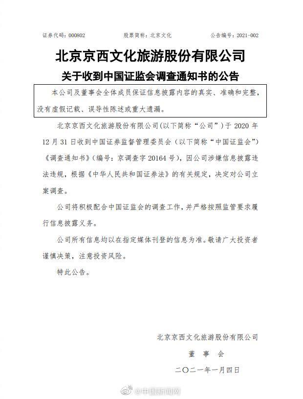 1月4日,北京京西文化旅游股份有限公司发布公告称,公司于2020年12月31日收到中国证券监督管理委员会《调查通知书》,因公司涉嫌信息披露违法违规,证监会决定对公司立案调查。北京文化曾出品《我和我的家乡》《战狼2》《我不是药神》《流浪地球》等电影。企查查显示,北京文化目前存在多笔股权质押。