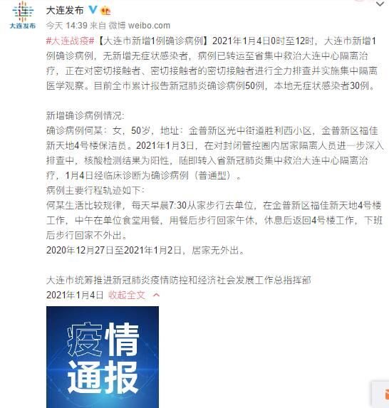 荔枝新闻讯 据大连市人民政府新闻办公室官方微博“大连发布”消息,2021年1月4日0时至12时,大连市新增1例确诊病例,无新增无症状感染者,病例已转运至省集中救治大连中心隔离治疗,正在对密切接触者、密切接触者的密切接触者进行全力排查并实施集中隔离医学观察。目前全市累计报告新冠肺炎确诊病例50例,本地无症状感染者30例。
