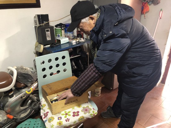 吕炎老人正在整理自己的修理工具。 陈晨 摄