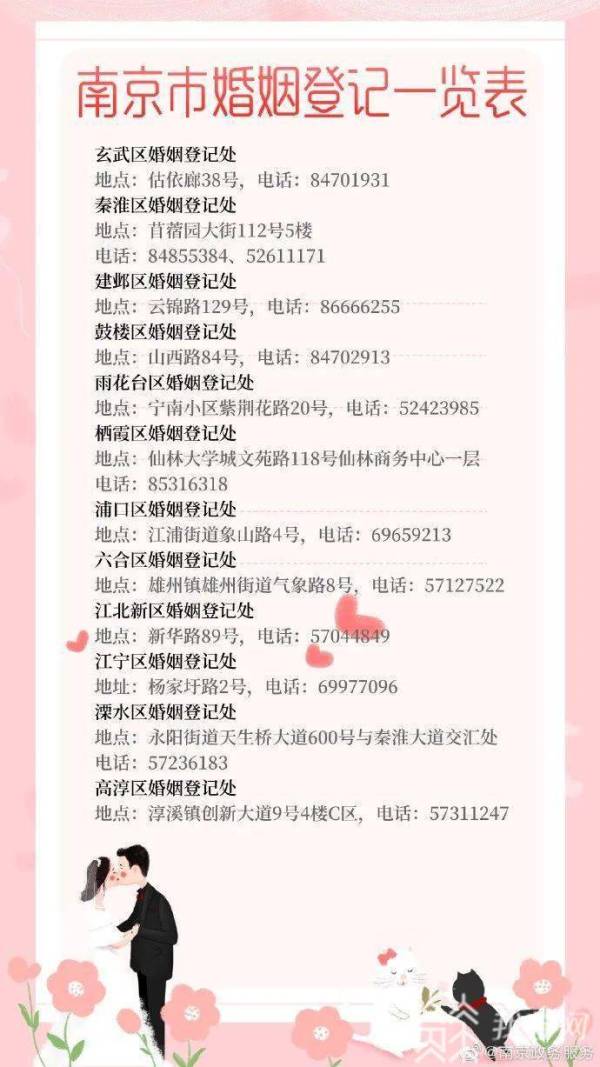 据悉,目前南京市跨区办理系统运行正常,市民可提前预约申请办理。当事人可通过江苏省婚姻登记网上预约系统、南京市婚姻登记网上预约系统、“南京民政”微信公众号、“我的南京”手机APP预约申请。