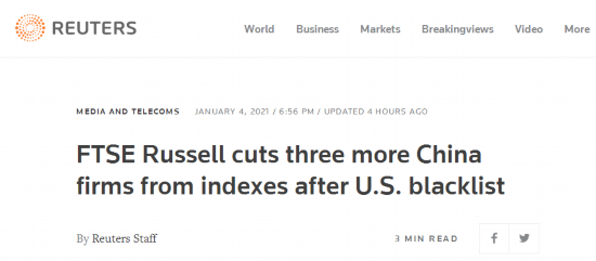 据英国路透社报道,全球指数编制公司富时罗素4日发表声明宣称,再将三家中企从其全球指数中移出。报道提到,此举缘于即将卸任的特朗普政府对中国企业的打压政策。
