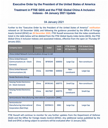 而根据这道行政令,去年12月初,富时罗素已宣布将8家中企从其全球指数中移出,包括海康威视、中国中车、中国化工等。除富时罗素外,标普道琼斯指数公司、纳斯达克证券交易所、明晟也先后在特朗普政府发布相关禁止投资中国企业的行政令后,将中企从其相关指数中移出。