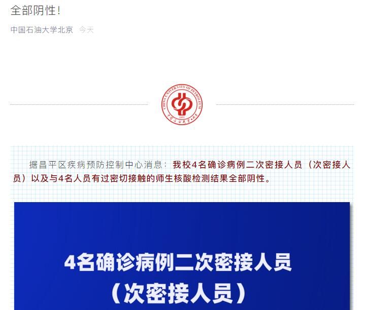 荔枝新闻讯 中国石油大学北京微信公号今日发布消息称,据北京市昌平区疾病预防控制中心消息:中国石油大学(北京)4名确诊病例二次密接人员(次密接人员)以及与4名人员有过密切接触的师生核酸检测结果全部阴性。