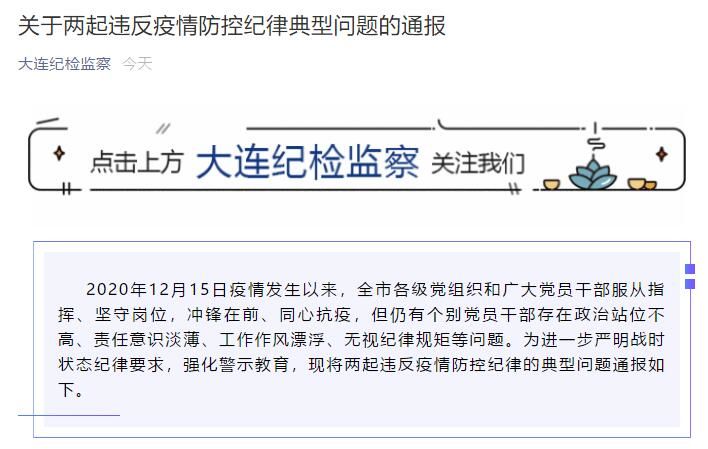 荔枝新闻讯 据中共大连市纪律检查委员会机关微信公众号“大连纪检监察”今日发布的“关于两起违反疫情防控纪律典型问题的通报”消息:2020年12月15日疫情发生以来,大连市各级党组织和广大党员干部服从指挥、坚守岗位,冲锋在前、同心抗疫,但仍有个别党员干部存在政治站位不高、责任意识淡薄、工作作风漂浮、无视纪律规矩等问题。为进一步严明战时状态纪律要求,强化警示教育,现将两起违反疫情防控纪律的典型问题通报如下。