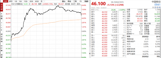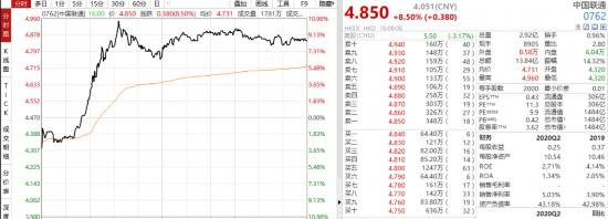 截至港股收盘,中国联通收涨8.5%,股价报4.85港元,中国电信收涨3.35%,股价报2.16港元,中国移动收涨5.13%,股价报46.1港元。