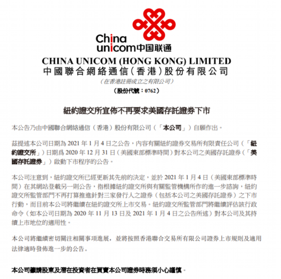 中国联通公告称,公司注意到,纽约证交所已经更新其先前的决定,指根据纽约证交所与有关监管机构所作的进一步咨询,纽约证交所监管部门不再打算推进针对三家发行人之证券(包括本公司之美国存托证券)之下市行动,而目前公司将继续在纽约证交所上市交易。