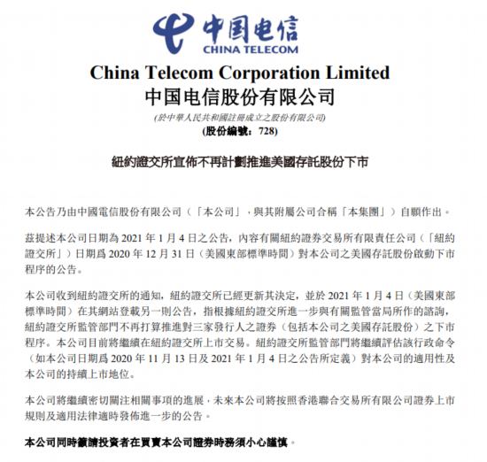 中国电信公告称,本公司目前将继续在纽约证交所上市交易。纽约证交所监管部门将继续评估该行政命令(如本公司日期为2020年11月13日及2021年1月4日之公告所定义)对本公司的适用性及本公司的持续上市地位。