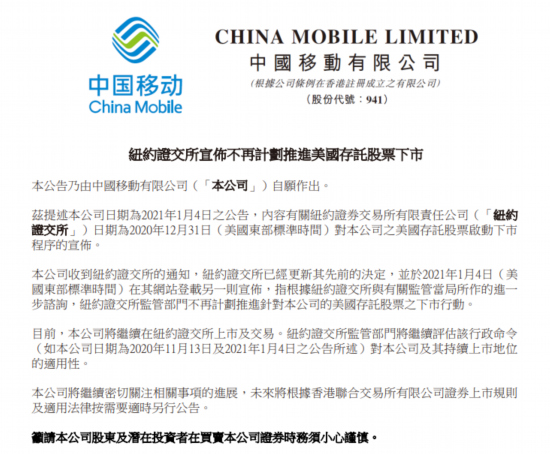 中国移动公告称,目前,本公司将继续在纽约证交所上市及交易。纽约证交所监管部门将继续评估该行政命令(如本公司日期为2020年11月13日及2021年1月4日之公告所述)对本公司及其持续上市地位的适用性。本公司将继续密切关注相关事项的进展,未来将根据香港联合交易所有限公司证券上市规则及适用法律按需要适时另行公告。