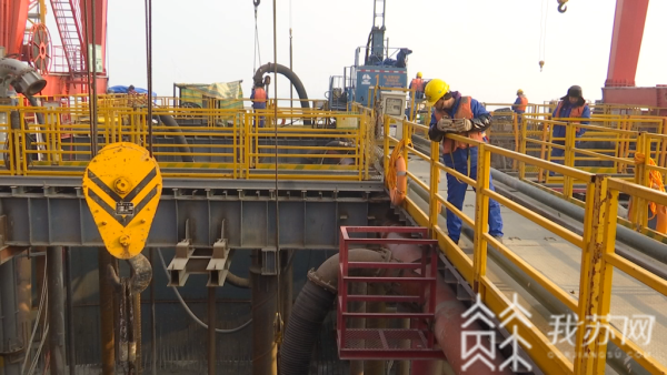 通过施工步道,沈建俊和工友们来到沉井上。所谓沉井,就是未来大桥的根基,现在的施工就是让沉井平稳且准确地下沉到江底。常泰长江大桥6号墩沉井是目前世界最大的水下沉井,平面面积接近一个足球场大小。让这样一个庞然大物下沉,需要精细操作,难度不言而喻。沉井内有36个井口,51台吸泥机不间断作业,把泥水抽到沉井外。吸泥越顺畅,沉井下沉也越快。