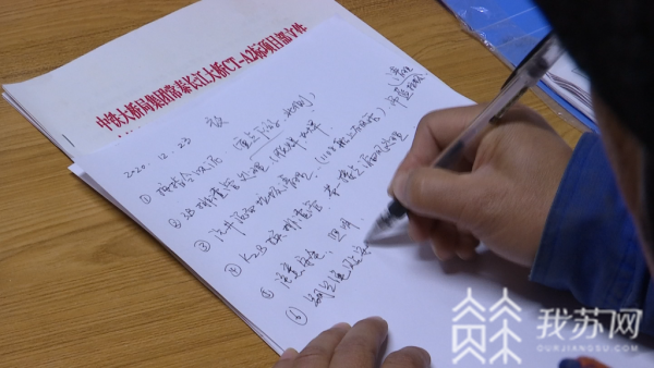 通过实时数据,沈建俊查看了今天沉井下沉状态。进入粘土层,沉井下沉很慢,最多一天也只能下沉20厘米。一天工作即将结束,沈建俊来到办公室,把一些注意事项写在工作记录上,留给晚班工友。
