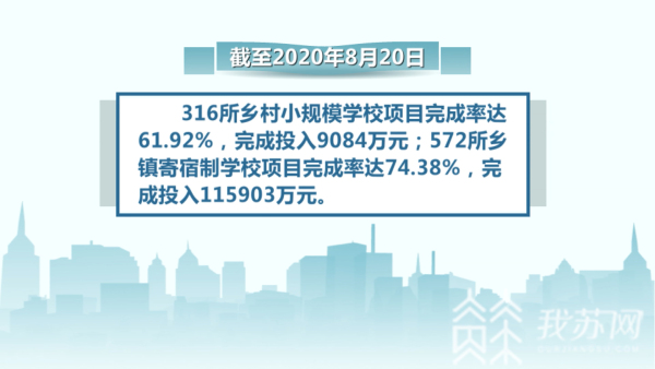 依据《江苏省乡村小规模学校和乡镇寄宿制学校基本办学条件要求》,我省研究制定了两类学校改善提升工程实施方案,工程化推进两类学校建设达标。截至2020年8月20日,316所乡村小规模学校项目完成率达61.92%,完成投入9084万元;572所乡镇寄宿制学校项目完成率达74.38%,完成投入115903万元。