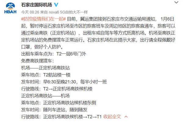 荔枝新闻讯 据“石家庄国际机场”官方微博号消息,1月6日上午石家庄机场航班起降正常。目前,冀运集团接到石家庄市交通运输局通知,1月6日起,暂时停运石家庄机场至市区的旅客班车及周边地区的旅客直通车,旅客可以通过乘坐高铁(正定机场站)、出租车或自驾车等方式抵离机场。机场至高铁正定机场站的免费摆渡车正常运行。