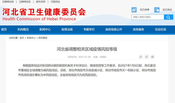 荔枝新闻讯 据河北省卫生健康委员会网消息,根据国务院应对新冠肺炎联防联控机制关于科学划分、精准防控等工作要求,自2021年1月6日起,将石家庄市藁城区全域调整为高风险地区。目前,邢台市南宫市天地名城小区、邢台市南宫市天一和院小区、邢台市南宫市凤岗街道办事处为中风险地区。全省其他地区均为低风险地区。