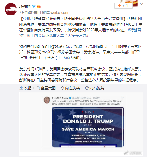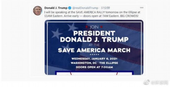特朗普当地时间5日傍晚发推称,“我将于东部时间明天上午11时在(白宫附近)椭圆形公园举行的‘拯救美国集会’上发表演讲。早点来——东部时间早上7时会开门。(会有)拥挤的人群!”↓