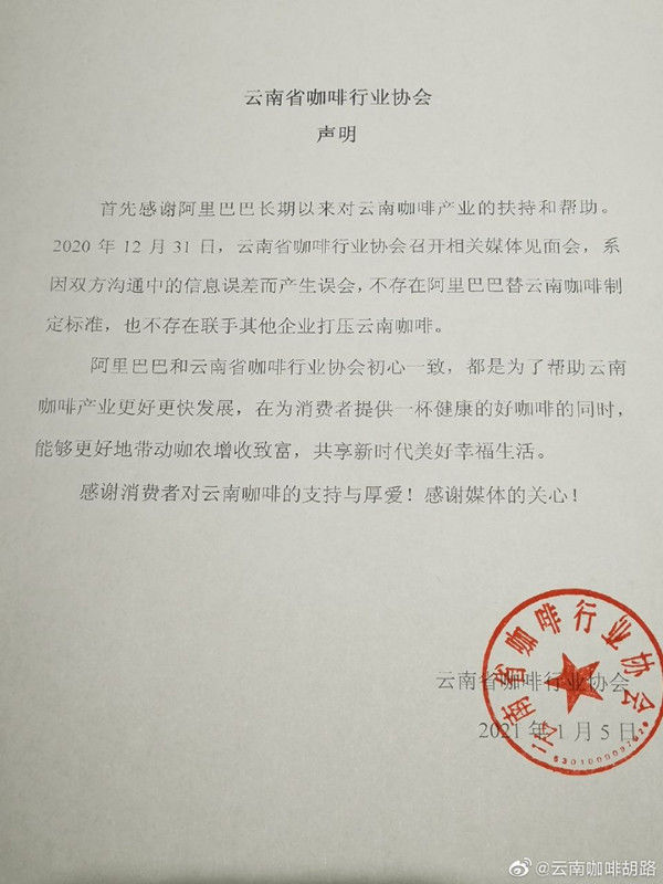 1月5日晚,云南省咖啡行业协会副会长胡路发布了一份云南省咖啡行业协会的声明。声明称,12月31日云南省咖啡行业协会召开相关媒体见面会,系因双方沟通中的信息误差而产生误会,“不存在阿里巴巴替云南咖啡制定标准,也不存在联手其他企业打压云南咖啡。”