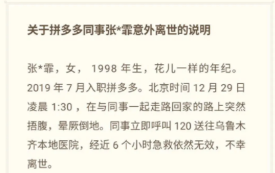 据@拼多多 微博账号消息,2020年12月29日凌晨1:30,该女员工在与同事回家的路上,突然捂腹,晕厥倒地。同事立即呼叫120送往乌鲁木齐本地医院。经近6个小时急救依然无效,不幸离世,年仅22岁。