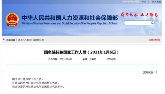据人社部网站消息,1月6日,国务院任免国家工作人员:任命谈践为常驻禁止化学武器组织代表,免去徐宏的常驻禁止化学武器组织代表职务。