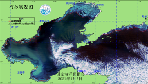 2021年1月5日海冰实况分析示意图,辽东湾最大浮冰范围40海里。