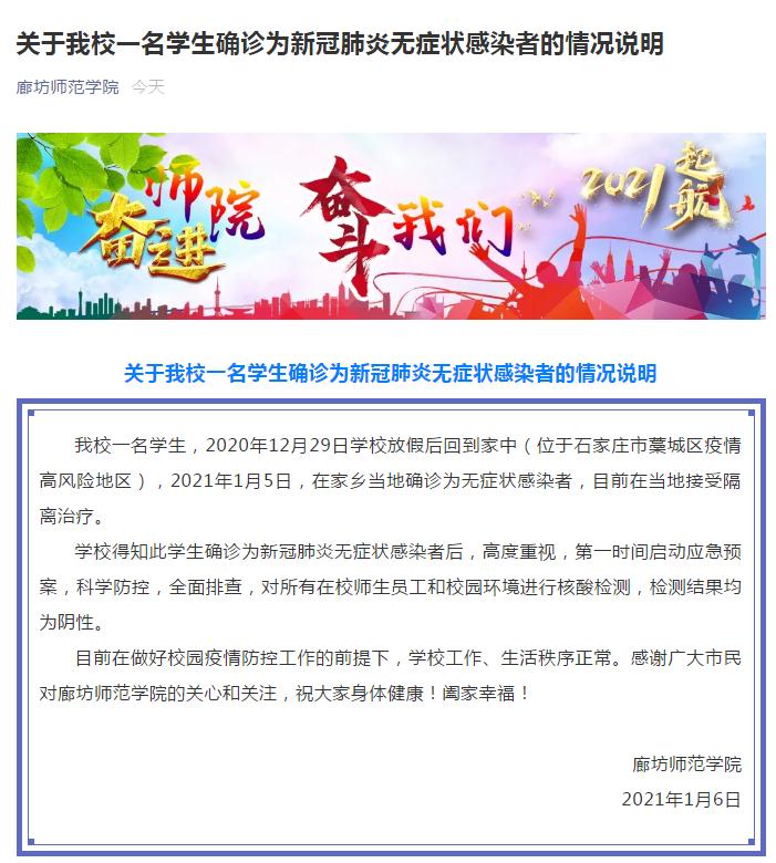 荔枝新闻讯 1月5日,河北廊坊师范学院一名学生放假回到石家庄藁城区的家中后,确诊为新冠肺炎无症状感染者。今天(1月6日),河北廊坊师范学院微信公众号发布《关于我校一名学生确诊为新冠肺炎无症状感染者的情况说明》,表示已对所有在校师生员工和校园环境进行核酸检测,检测结果均为阴性。